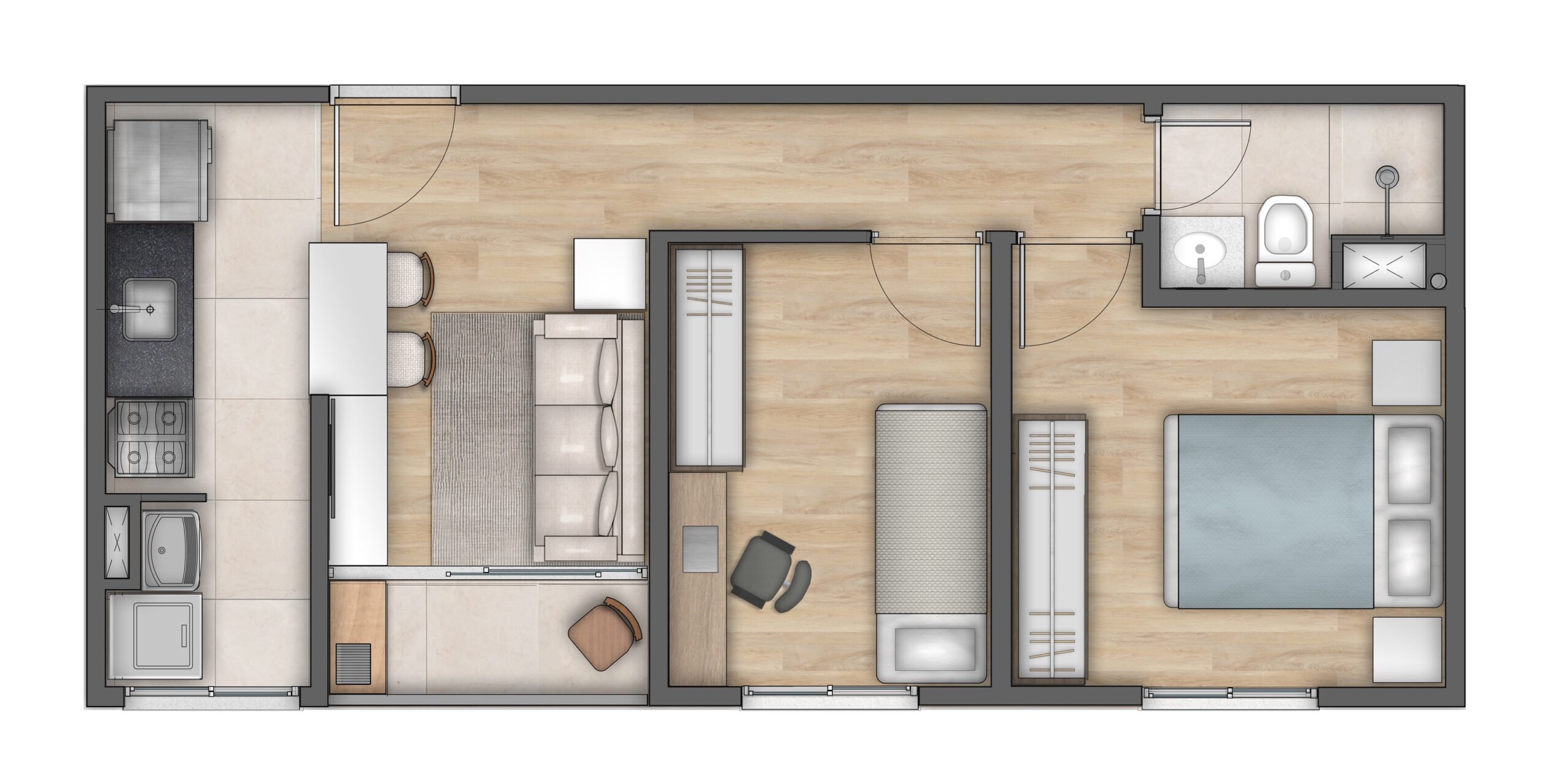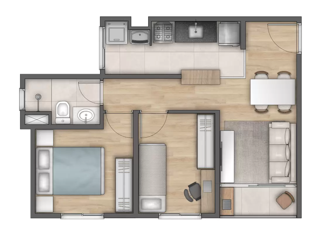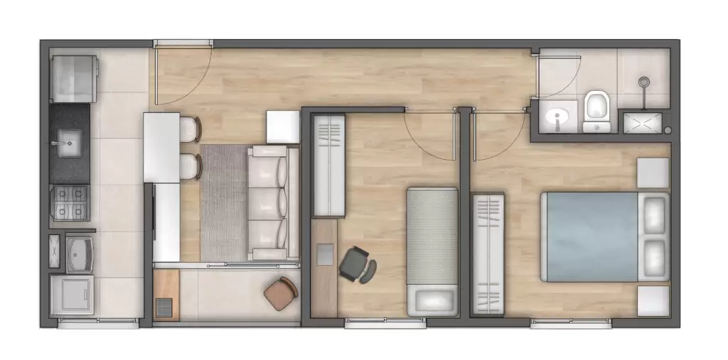 Unidades de 39m² com 1 e 2 quartos com Varanda e unidade de 42m² com 2 quartos e varanda